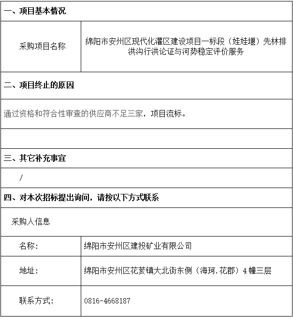 綿陽市安州區(qū)現(xiàn)代化灌區(qū)建設項目一標段(娃娃堰)先林排洪溝行洪論證與河勢穩(wěn)定評價服務流標公告